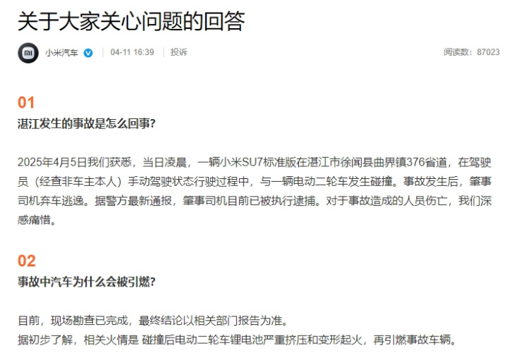 4月11日,小米汽车通过官方微博回应大家关心问题称,2025年4月5日凌晨,一辆小米SU7标准版在湛江市徐闻县曲界镇376省道,在驾驶员(经查非车主本人)手动驾驶状态行驶过程中,与一辆电动二轮车发生碰撞。